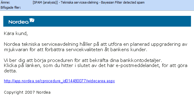 The phishing attempts against Nordea are still going strong and the mails are now in almost correct swedish.
